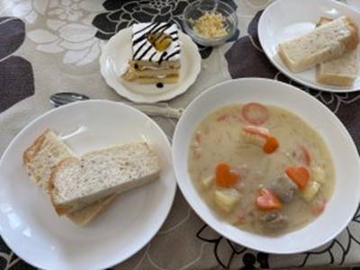 2月14日(土)調理実習 今日は、バレンタインデーということもあって、ラブリ−な献立にしてみました。人参をハート型に抜いたり、チョコソースでデコレーションしたケーキも作ったりして、かわいらしく仕上げました。見た目だけでなく、とってもおいしくできあがりましたよ。